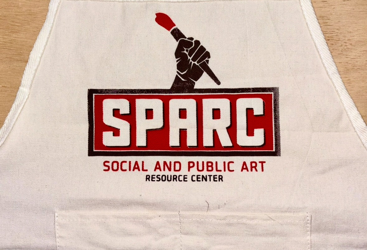 A lightweight canvas apron designed for artists, muralists, and makers, created by the Social and Public Art Resource Center (SPARC).